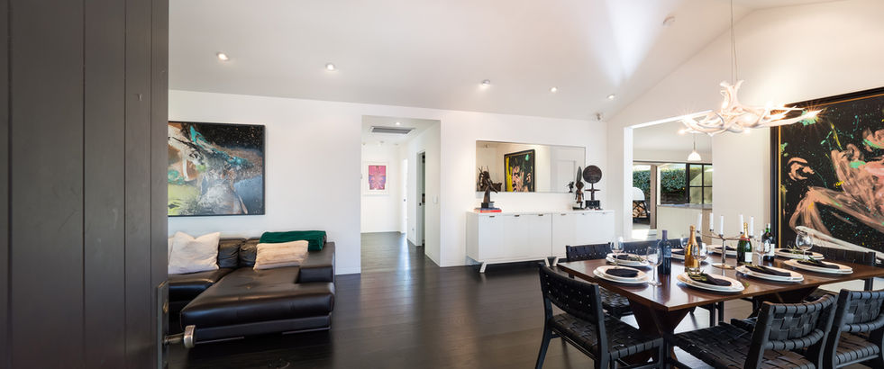 Inside, you'll be impressed with how spacious this 1583± square-foot home feels, with vaulted ceilings, wide plank wood floors, and outdoor access from every room. The open-concept living room and dining room open to the courtyard and visible through floor to ceiling glass windows. The state-of-the-art kitchen is adjacent to the dining room, appointed with a full Viking appliance suite and marble island, perfect for creating memorable meals, and opens to a covered courtyard. The two ensuite bedrooms have spacious closets and bathrooms, each leading to the lap pool. The outdoor living area includes a courtyard, pizza oven, Weber Grill, TV, resort-style lounging area next to the lap pool, and garden with citrus trees and raised garden beds. The converted two-car garage serves as an additional living space and media room with TV, board games, and a laundry area.